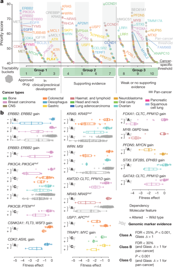 图1a展示了研究者开发的一种多种癌症类型中靶标优先选择的策略,利用Project score数据库和R包ADaM对每个相关基因分配优先级分数。