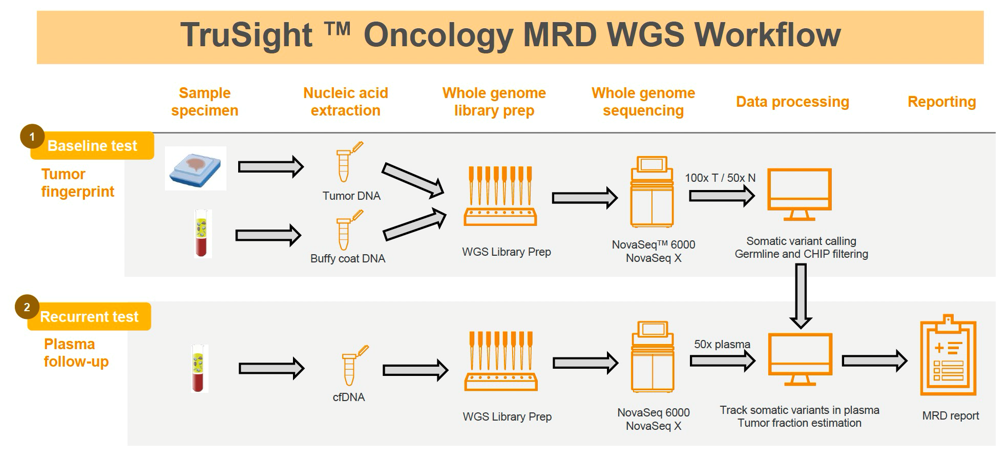 TSO MRD基于因美纳强大的WGS文库构建、生信分析和测序技术。检测过程分为两个主要步骤——分子指纹分析和ctDNA检测。​分子指纹分析(fingerprinting)通过WGS分析肿瘤组织和匹配的正常样本DNA,生成样本特异性的体细胞变异列表。这一步骤为后续的ctDNA检测提供了个性化的变异指纹。​ctDNA检测利用浅层WGS分析从血浆提取的cfDNA,根据肿瘤特异性分子指纹检测ctDNA的存在与否,并进行MRD分析。​整个血浆核酸提取和WGS文库制备流程完全自动化,以最少的手动操作时间和接触点实现完全样本的高通量处理。​