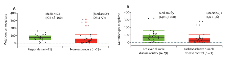 图2:对西米普利治疗有应答的患者中,其中位TMB水平显著高于无应答患者 (74 vs 29 muts/Mb);同时在治疗后疾病得到控制的患者中,其中位TMB水平显著高于未控制的患者 (100 vs 31 muts/Mb)