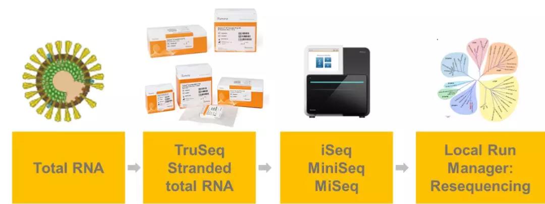 图5:Illumina冠状病毒测序全流程解决方案 (病毒示意图与亲缘进化关系图来自网络)